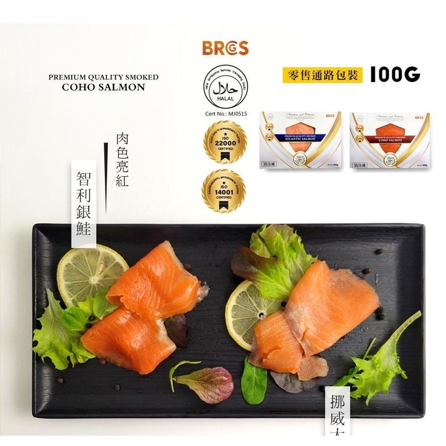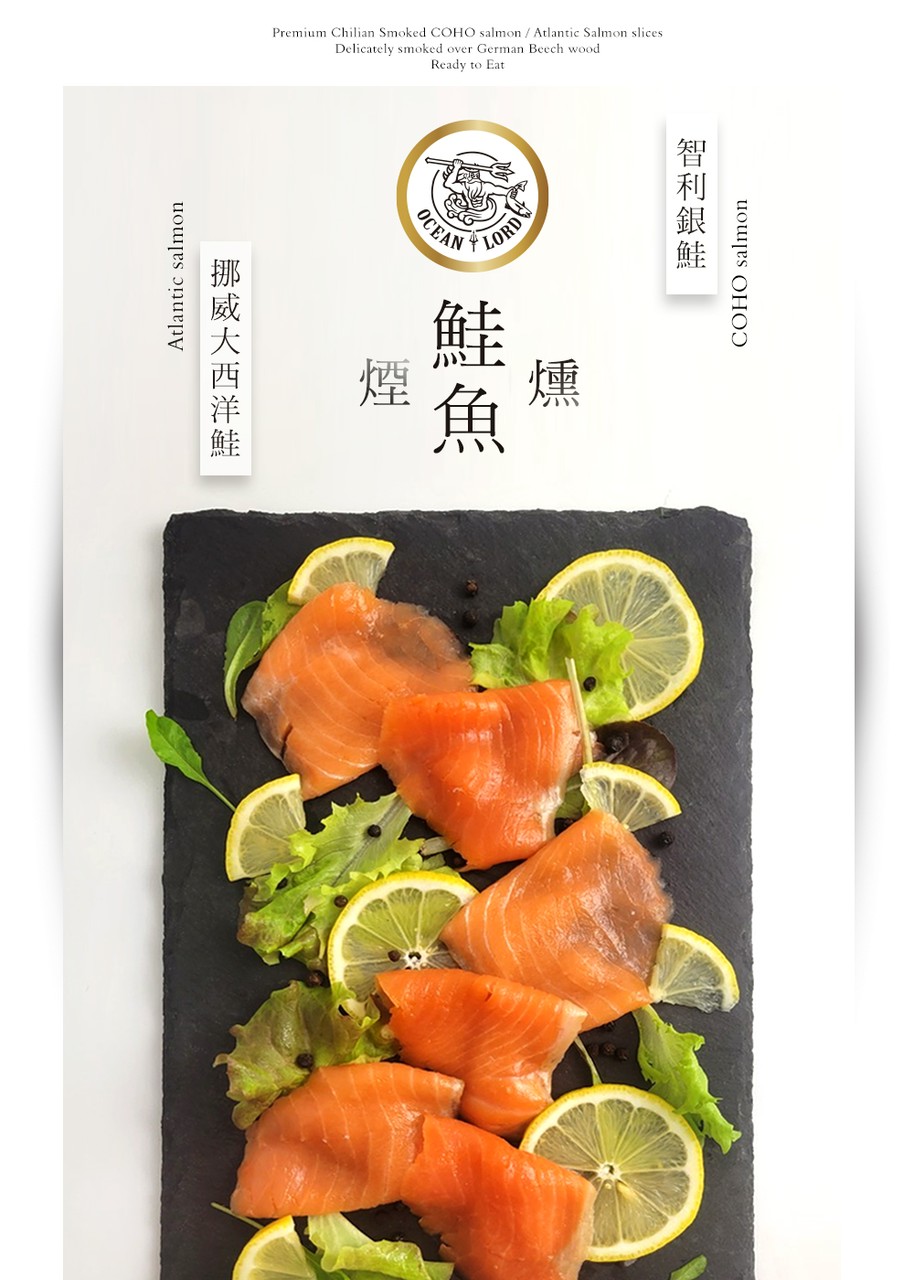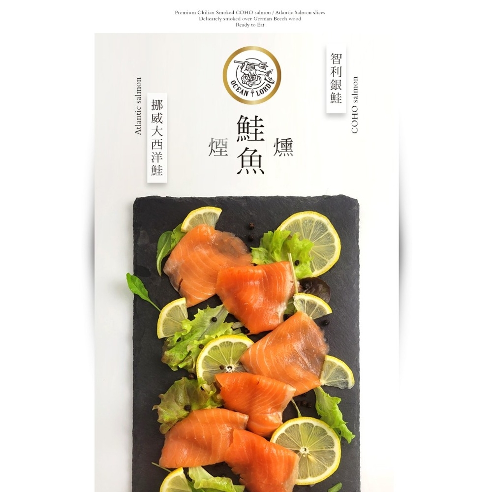 精挑優良鮭魚品種,以海鹽醃漬後,擦乾魚肉,使用核桃木以約5℃低溫燻製7小時,使鮭魚熟成並依然保有食材鮮味及細膩柔嫩口感。